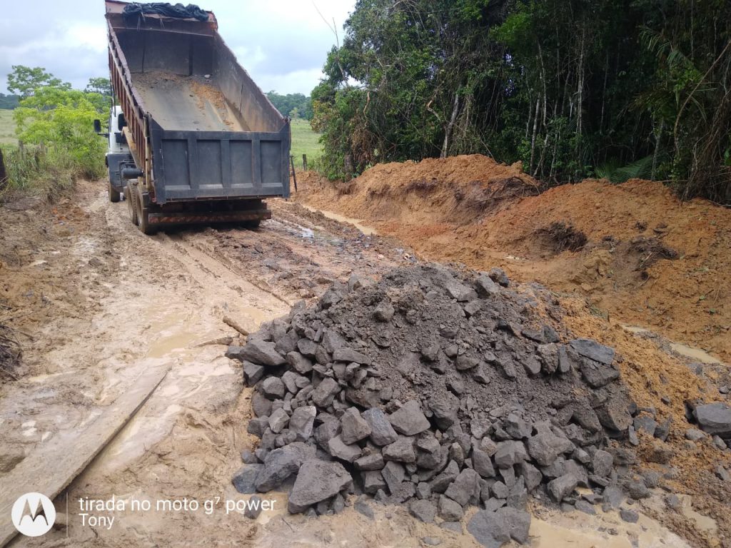 Farias: Recuperação da estrada do Canto Grande na região do Farias, com a aplicação de pedra marroada, a fim de estabilizar o pavimento, visto que devido às fortes chuvas o nível do lençol freático está alto, ocasionando a ruptura do solo.
