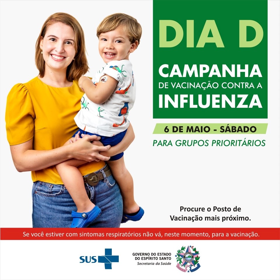 Neste sábado (06), o Espírito Santo estará empenhado em prol da vacinação contra a Influenza. A data marca o dia D de mobilização, com vacinas disponíveis aos públicos prioritários em 62 municípios capixabas, com a expectativa de 68 mil pessoas imunizadas. A data é uma iniciativa da Secretaria da Saúde (Sesa), aprovada em Resolução Nº 039/2023, da Comissão Intergestora Bipartite (CIB).