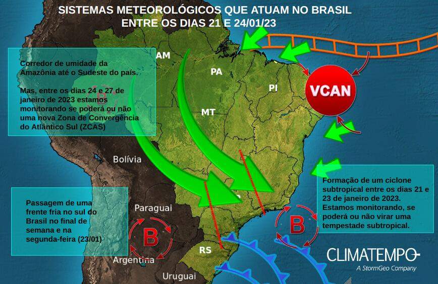 Além disso, também é monitorado o corredor de umidade persistente da Região Norte ao Sudeste do país, que pode virar ou não uma nova Zona de Convergência do Atlântico Sul (ZCAS), podendo durar entre 24 e 27 de janeiro de 2023.