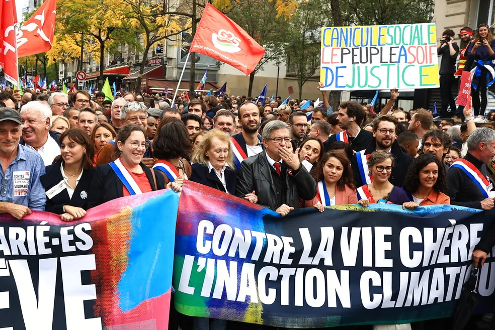 O líder da extrema esquerda do país, Jean-Luc Melenchon, e a vencedora do Prêmio Nobel de Literatura deste ano, a escritora Annie Ernaux, lideraram o ato, que também mostrou apoio a uma greve de três semanas nas refinarias da frança