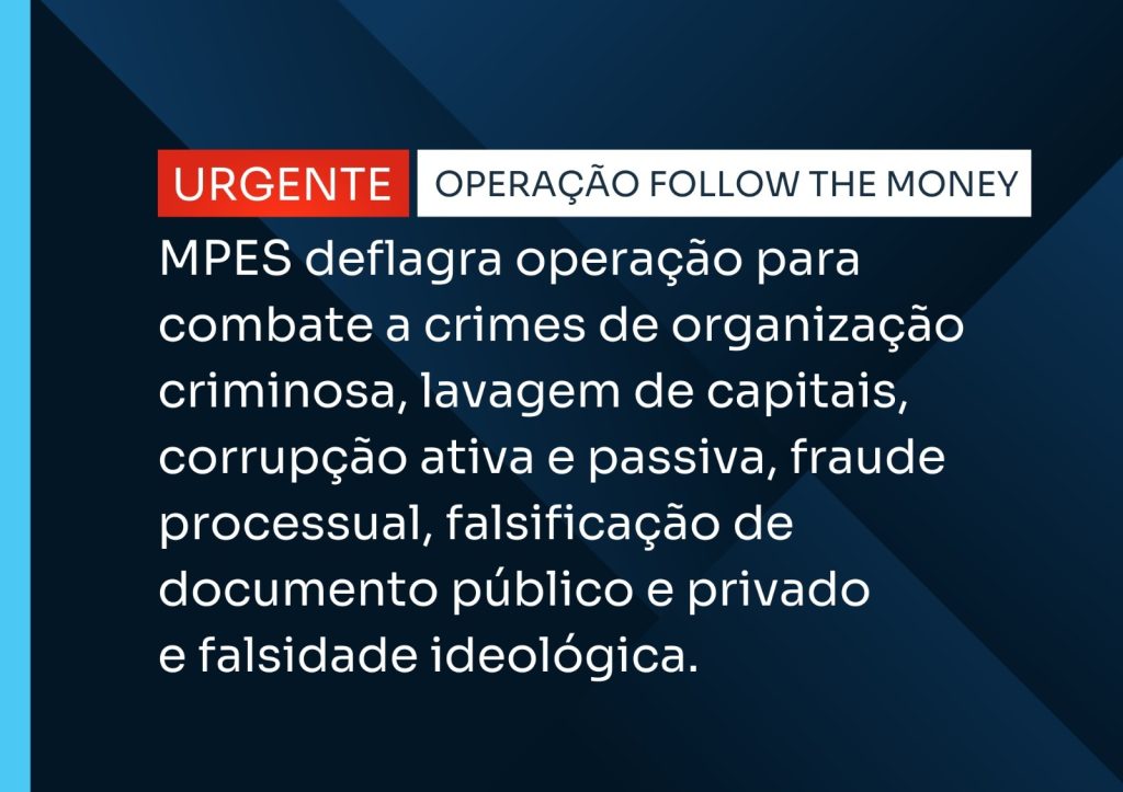 O Ministério Público do Estado do Espírito Santo (MPES) desencadeou, na manhã desta quinta-feira (01/08), a “Operação Follow the Money, com o objetivo de desarticular uma suposta organização criminosa que envolve agentes públicos, advogados e particulares. A ação, coordenada pela Procuradoria-Geral de Justiça e pelo Grupo de Atuação Especial de Combate ao Crime Organizado (GAECO CENTRAL E NORTE), conta com o apoio da Polícia Militar.