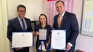 O parlamentar também se reuniu com a presidente nacional do Podemos, deputada Renata Abreu, fazendo a entrega da Comenda Domingos Martins e o título de cidadania Espírito-santense. “A deputada federal, em sua liderança no partido, tem auxiliado a bancada capixaba na busca por recursos e investimentos em prol do desenvolvimento do nosso Estado, portanto essa homenagem é muito merecida”, destacou o presidente da Assembleia Legislativa do ES.