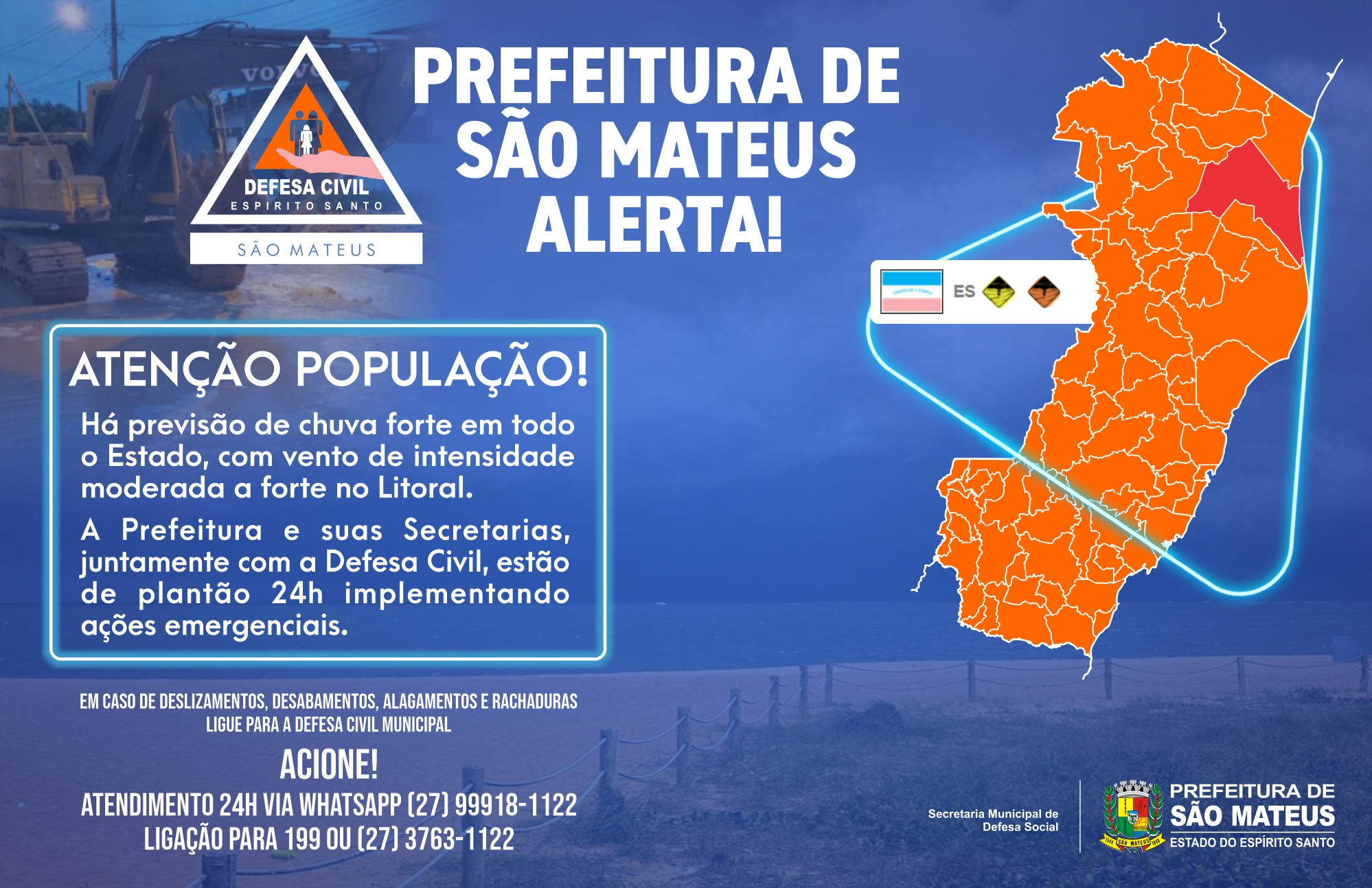 E os temporais não dão trégua: segundo dados da Estação Meteorológica Automática do Cemaden em São Mateus, choveu 101,5mm durante a madrugada desta quarta-feira (14), a segunda maior precipitação do País registrada no período – a maior foi em Petrópolis, RJ.